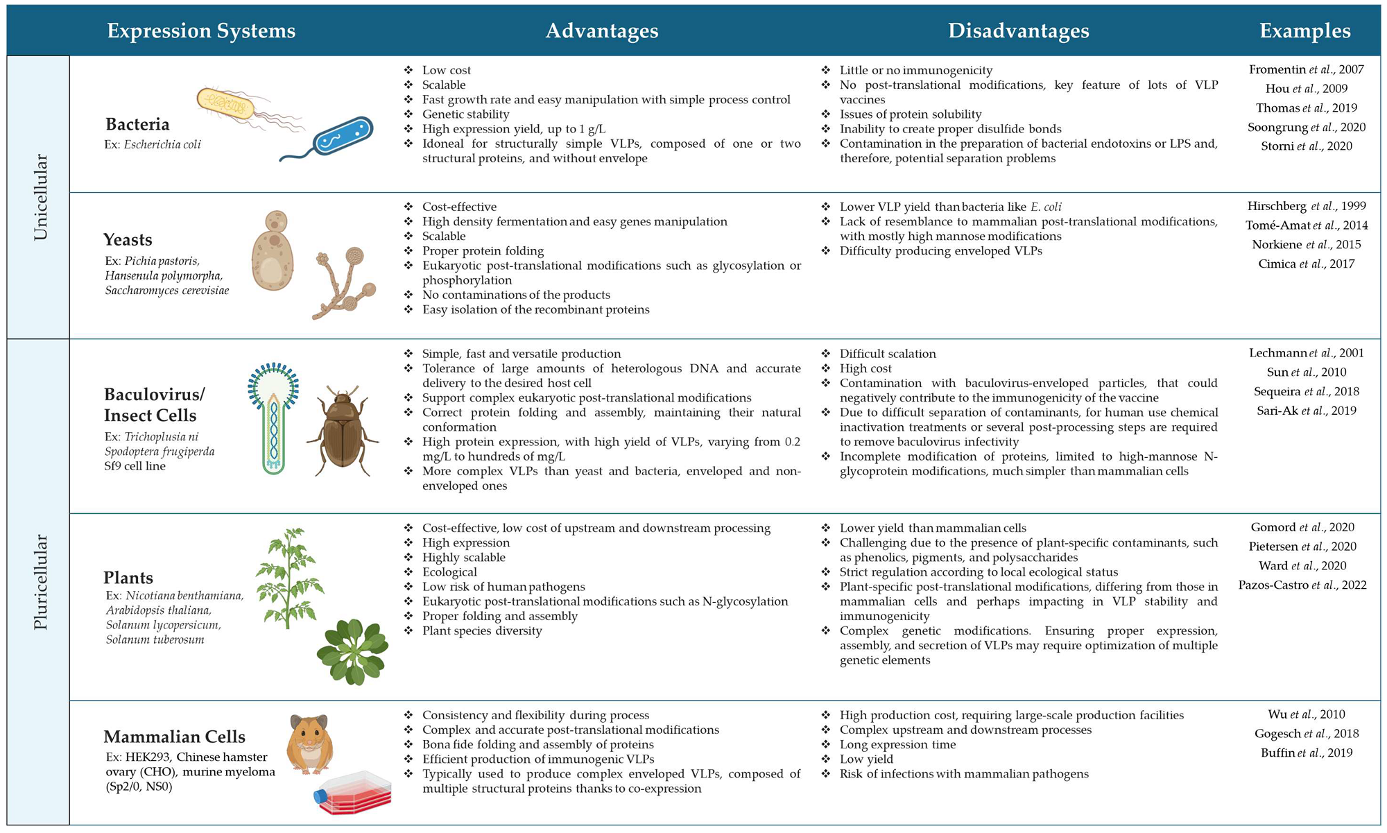 Figure 3. Advantages and disadvantages of different expression systems for the recombinant production of VLPs(Int. J. Mol. Sci. 2024, 25(13), 7429)