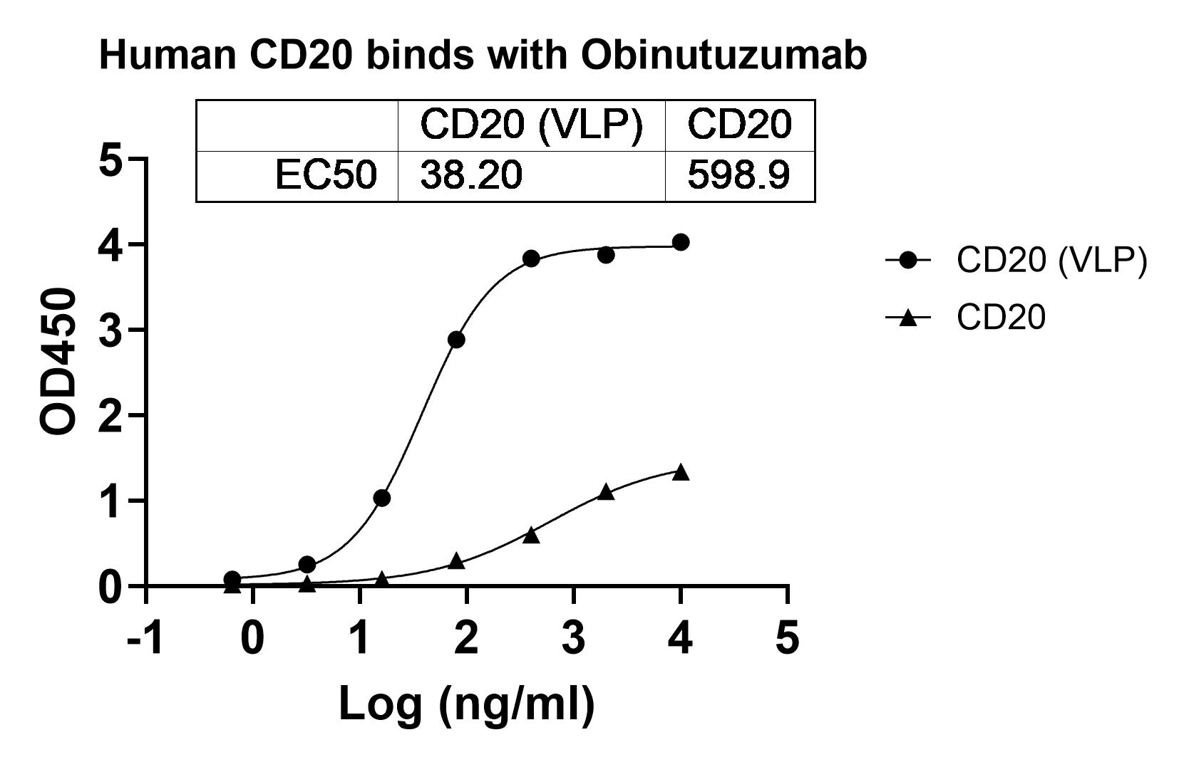 Immobilized CD20 (VLP)(CAT#AHC90705) can bind Obinutuzumab. The EC50 of CD20 (VLP) is 38.2 ng/ml.