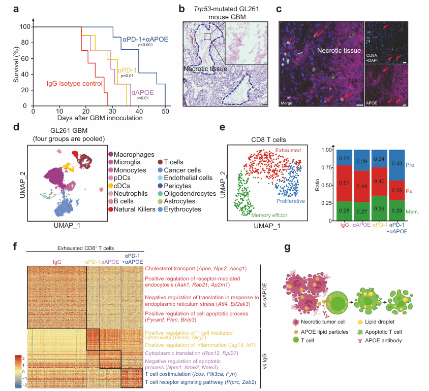 This study is the first to fully elucidate a novel immune evasion pathway from "tumor necrosis" to "APOE release," leading to "lipid accumulation and functional exhaustion of immune cells," providing a new perspective for understanding tumor immune evasion mechanisms. The proposed anti-APOE therapeutic strategy, particularly in combination with immune checkpoint inhibitors, offers a new direction for immunotherapy of refractory tumors like glioblastoma. Given that APOE antibodies have already been under development for Alzheimer's disease, this strategy has promising clinical translation potential and is expected to bring new breakthroughs in cancer immunotherapy.