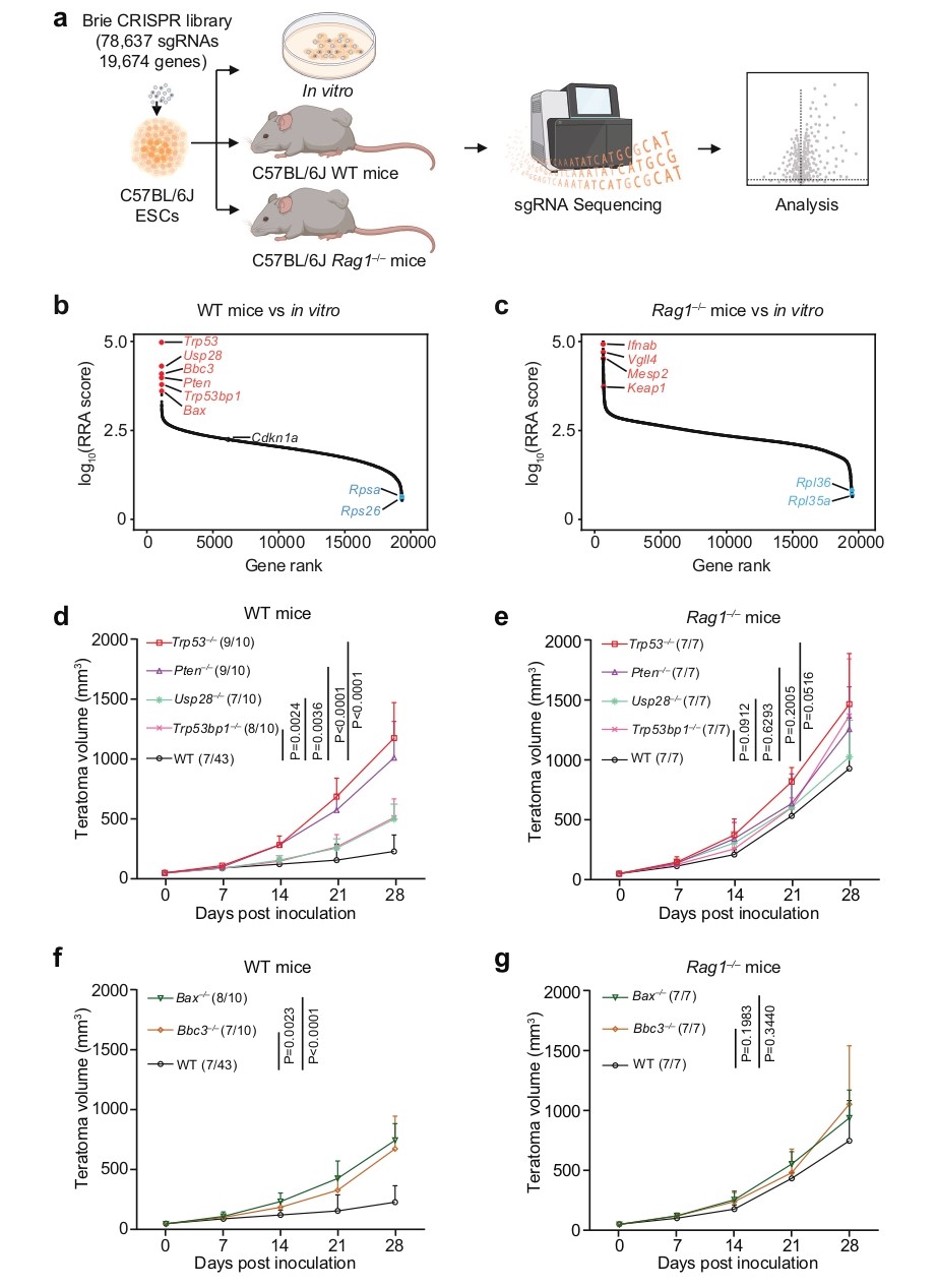 Researchers analyzed key genes affecting early immune surveillance using a genome-wide CRISPR screening system. As shown in Figure 2a, the Brie CRISPR library was transduced into mESCs, which were then transplanted into immunocompetent or immunodeficient mice. Gene ranking plots (Fig. 2b-c) showed that sgRNAs targeting Trp53, Pten, Usp28, and Tp53bp1 were significantly enriched in immunocompetent mice, while sgRNAs targeting Bbc3 and Bax also showed selective enrichment. Growth curves (Fig. 2d-g) further confirmed that Trp53⁻/⁻, Pten⁻/⁻, Bbc3⁻/⁻, and Bax⁻/⁻ mESCs formed teratomas much more efficiently in immunocompetent mice, whereas the differences were not significant in immunodeficient mice. These results indicate that the loss of pro-apoptotic tumor suppressor genes selectively promotes tumor growth in immunocompetent hosts.