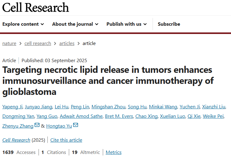 In September 2025, a research paper titled "Targeting necrotic lipid release in tumors enhances immunosurveillance and cancer immunotherapy of glioblastoma" in the journal Cell Research. This study reveals for the first time a novel immune evasion mechanism whereby loss of pro-apoptotic tumor suppressor genes (such as TP53) triggers mPTP-dependent necrosis, releasing APOE-containing lipid particles that lead to T cell dysfunction. Furthermore, it proposes that clearing excess APOE lipid particles from the immune microenvironment is a new strategy to restore the function of tumor-infiltrating T cells and enhance the efficacy of immunotherapy for glioblastoma (GBM).