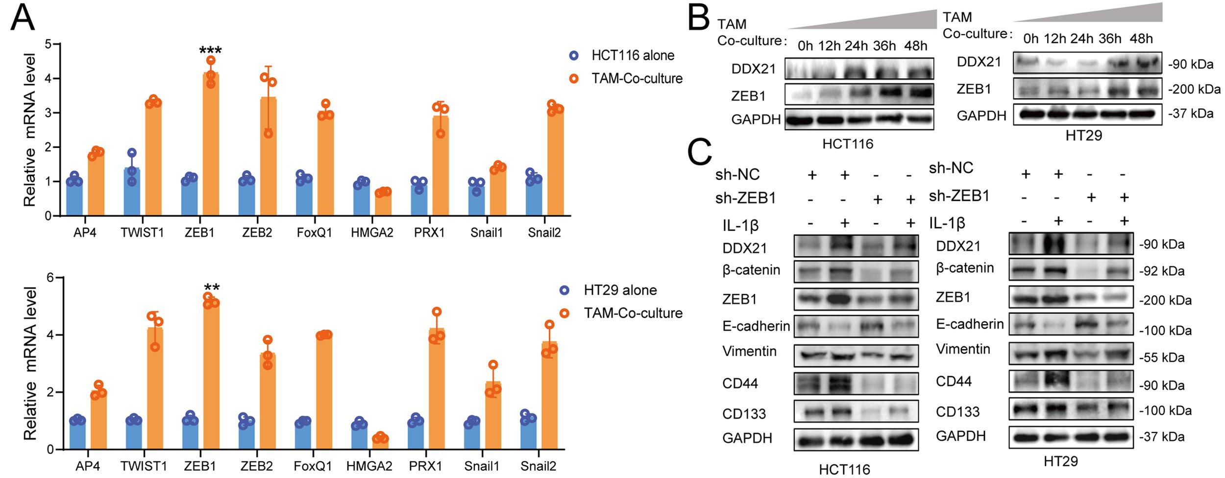 This study reveals a critical feedback loop between colorectal cancer (CRC) cells and tumor-associated macrophages (TAMs). We found that TAMs promote CRC proliferation, metastasis, and stemness by secreting IL-1β, which activates the JAK2/STAT3 pathway in cancer cells. Activated STAT3 binds to and stabilizes the DDX21 protein. DDX21, in turn, upregulates ZEB1 expression, leading to the secretion of the chemokine CCL8. CCL8 recruits more macrophages, thereby sustaining the loop. In vivo, IL-1β knockdown impaired TAM-induced tumorigenesis. Clinically, high levels of IL-1β and the TAM marker CD206 correlate with poor patient prognosis. These findings identify TAM-derived IL-1β as a promising immunotherapeutic target for CRC.