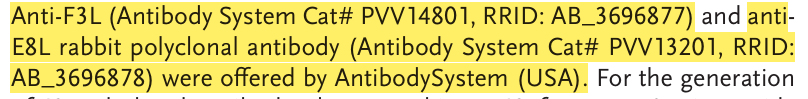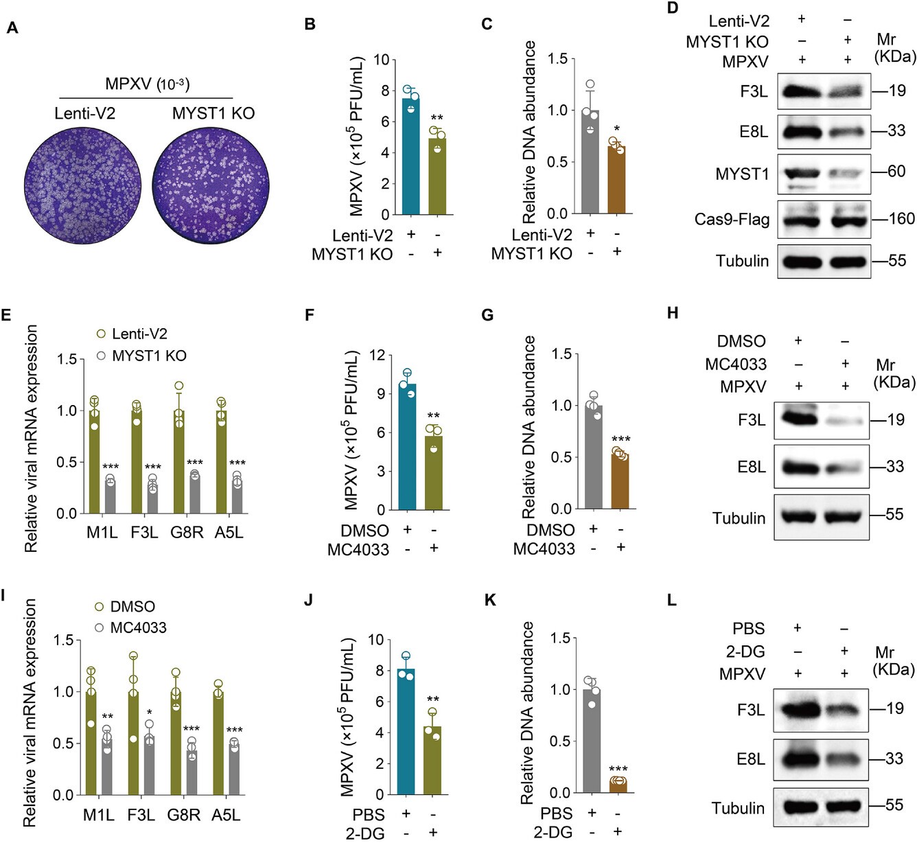 This study cited AntibodySystem's Anti-Monkeypox virus/MPXV F3L Polyclonal Antibody (Catalog #PVV14801) and Anti-Monkeypox virus/MPXV E8L Polyclonal Antibody (Catalog #PVV13201) for Western Blot experiments, confirming that targeting MYST1 or aerobic glycolysis effectively inhibits MPXV viral protein expression and viral replication.