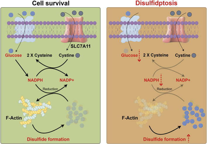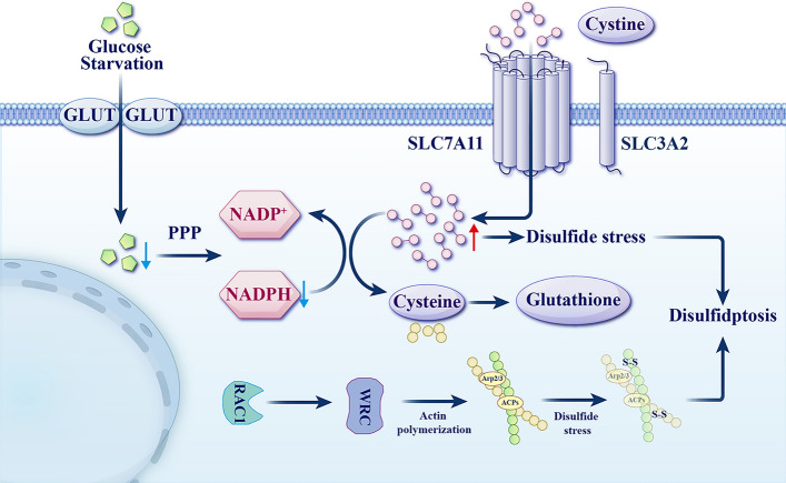 Conversely, if high SLC7A11 expression occurs alongside glucose starvation or uptake blockade, it results in massive cystine uptake and its reduction to cysteine, concomitant with NADPH depletion and intracellular disulfide accumulation, ultimately inducing disulfide stress. This stress state, through activation of the Rac–WRC–Arp2/3 signaling pathway, promotes the formation of aberrant disulfide bonds in actin cytoskeletal proteins, thereby triggering disulfidptosis.