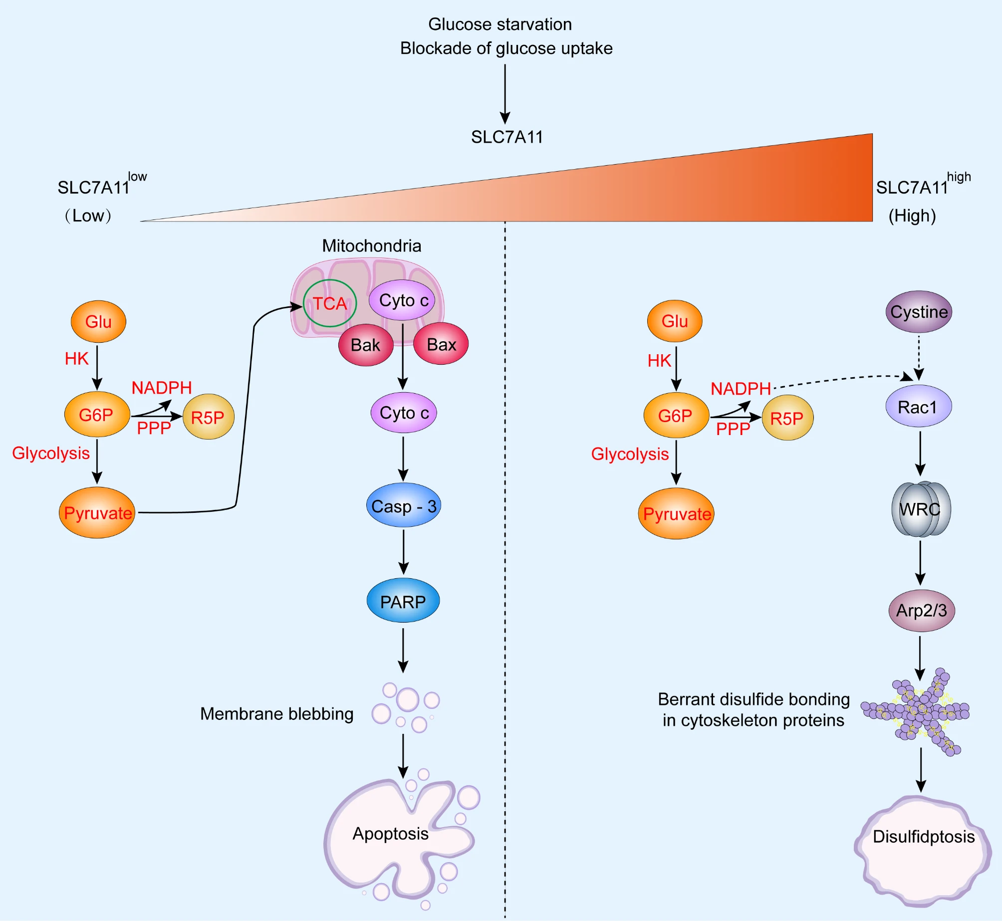 Notably, if low SLC7A11 expression coincides with glucose starvation or uptake blockade, intracellular glucose levels decrease, inhibiting hexokinase-mediated production of glucose-6-phosphate. This subsequently impedes both NADPH generation via the PPP and pyruvate production via glycolysis. These reactions further suppress pyruvate metabolism in the tricarboxylic acid (TCA) cycle and mitochondrial oxidative phosphorylation, ultimately inducing oxidative stress and ATP depletion. This process involves upregulation of Bax/Bak expression, promoting cytochrome c release from mitochondria, activation of caspase-3, and PARP-mediated membrane blebbing, leading to apoptosis.