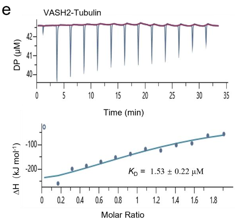 AntibodySystem’s Recombinant Human VASH2/Vasohibin-2 Protein, N-His-SUMO (Cat. No. YHK84701) was used in isothermal titration calorimetry (ITC) assays to demonstrate that the microtubule inhibitor KY216 markedly enhances the interaction between VASH2 and tubulin. The presence of KY216 increased the binding affinity by approximately 2.9-fold and reduced the Gibbs free energy of the interaction. These results provide critical molecular interaction evidence that KY216 suppresses metastasis by stabilizing the VASH2–tubulin complex, promoting α-tubulin detyrosination, and inhibiting ZEB1 activity.