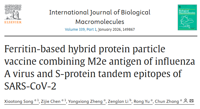 This study presents a hybrid protein particle vaccine based on human ferritin heavy chain. Influenza A virus M2e and SARS-CoV-2 spike tandem epitopes (STE) were expressed separately in E. coli and co-assembled into hybrid particles. In mice, the vaccine elicited significantly enhanced antibody responses, effectively inhibited SARS-CoV-2 pseudovirus infection, and mediated ADCC activity, demonstrating strong potential for combined viral prevention.