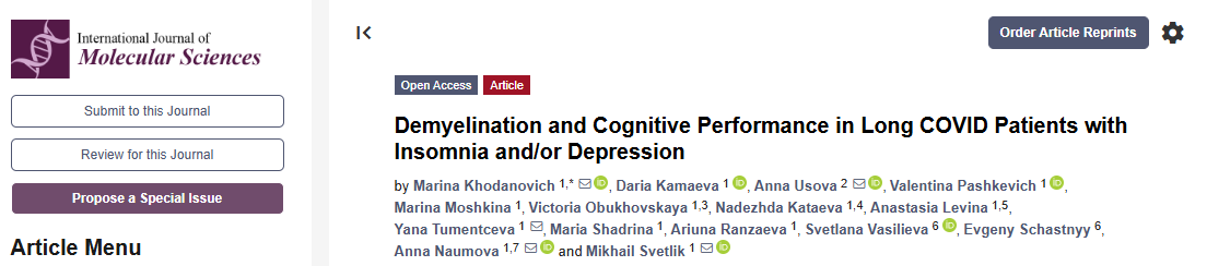 Demyelination and Cognitive Performance in Long COVID Patients with Insomnia and/or Depression