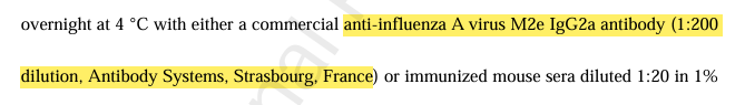 AntibodySystem’s Anti-Influenza A Virus M2 Ectodomain/M2e Antibody (Fab65)(Cat. No. RVV23403) was used in confocal microscopy to validate surface expression of M2 protein on 293T-M2 cells, providing a foundation for subsequent functional evaluation of M2e-specific antibodies in immunized sera.