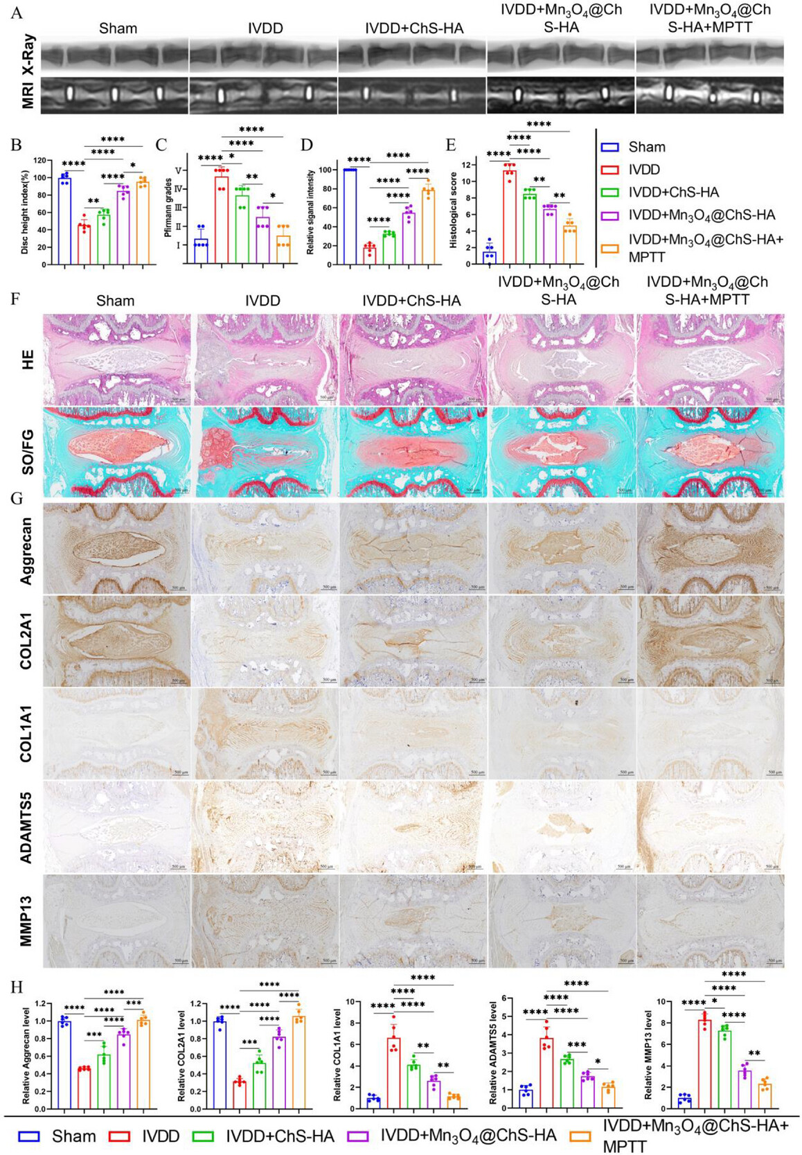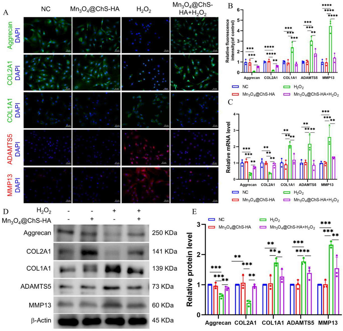 At the molecular level, Mn3O4@ChS-HA restored Aggrecan and COL2A1 expression to 190% of normal levels and reduced the matrix-degrading enzymes MMP13/ADAMTS5 by 50%.