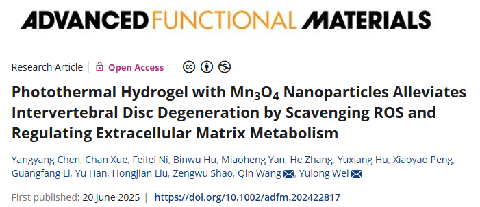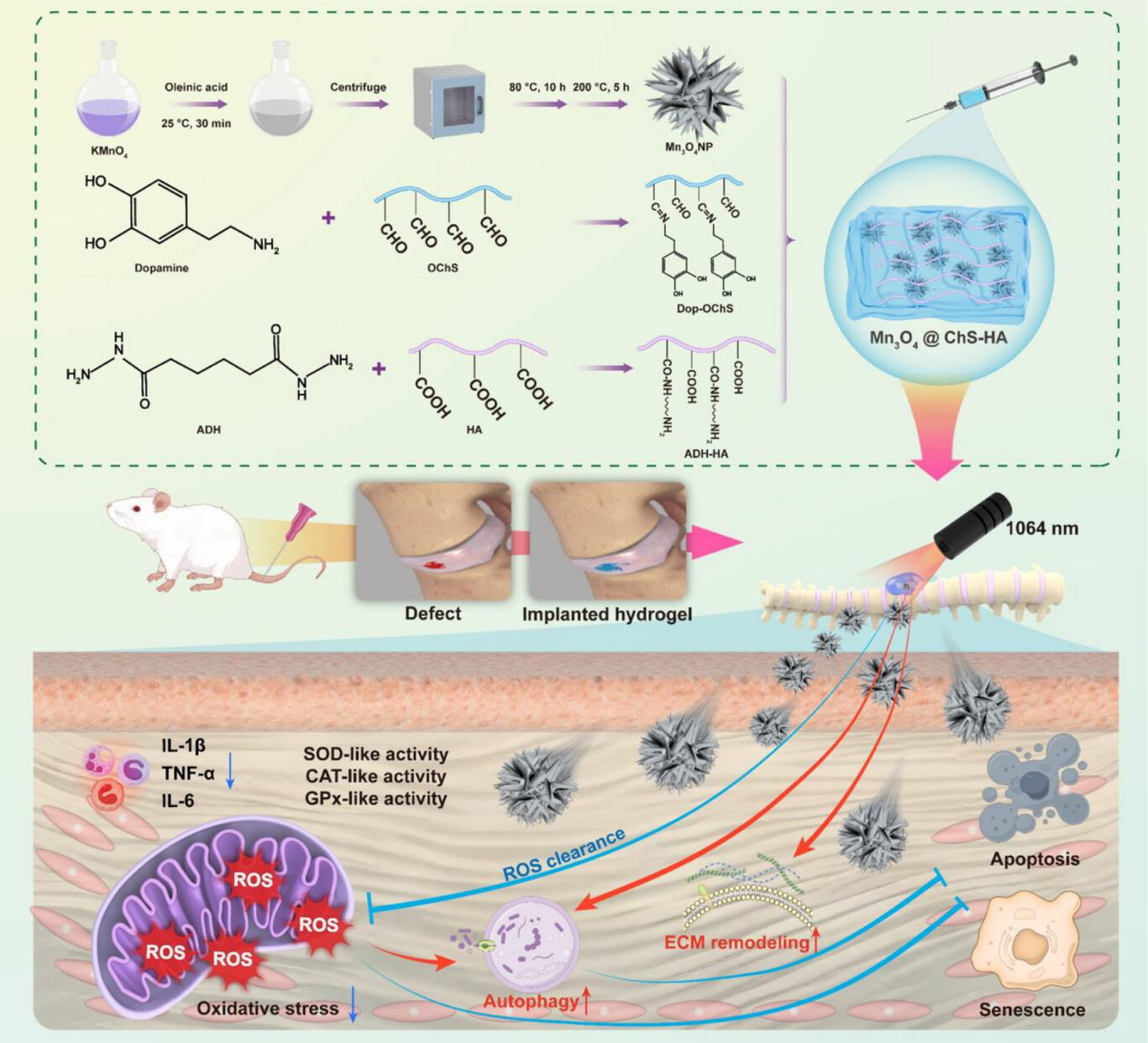 To address these issues, a study published in Advanced Functional Materials titled "Photothermal Hydrogel with Mn₃O₄ Nanoparticles Alleviates Intervertebral Disc Degeneration by Scavenging ROS and Regulating Extracellular Matrix Metabolism" developed an injectable photothermal hydrogel, Mn3O4@ChS-HA. This system comprises dopamine-grafted oxidized chondroitin sulfate (dop-OChS), adipic dihydrazide-modified hyaluronic acid (ADH-HA), and Mn3O4 nanoparticles to repair annulus fibrosus (AF) defects. The hydrogel mimics the native intervertebral disc microenvironment, exhibiting exceptional mechanical properties and strong adhesion to AF lesion sites while enabling long-term retention of Mn3O4 nanoparticles. Critically, Mn3O4 nanoparticles exhibit catalytic properties analogous to superoxide dismutase, catalase, and glutathione peroxidase, efficiently scavenging ROS and modulating ECM metabolism.