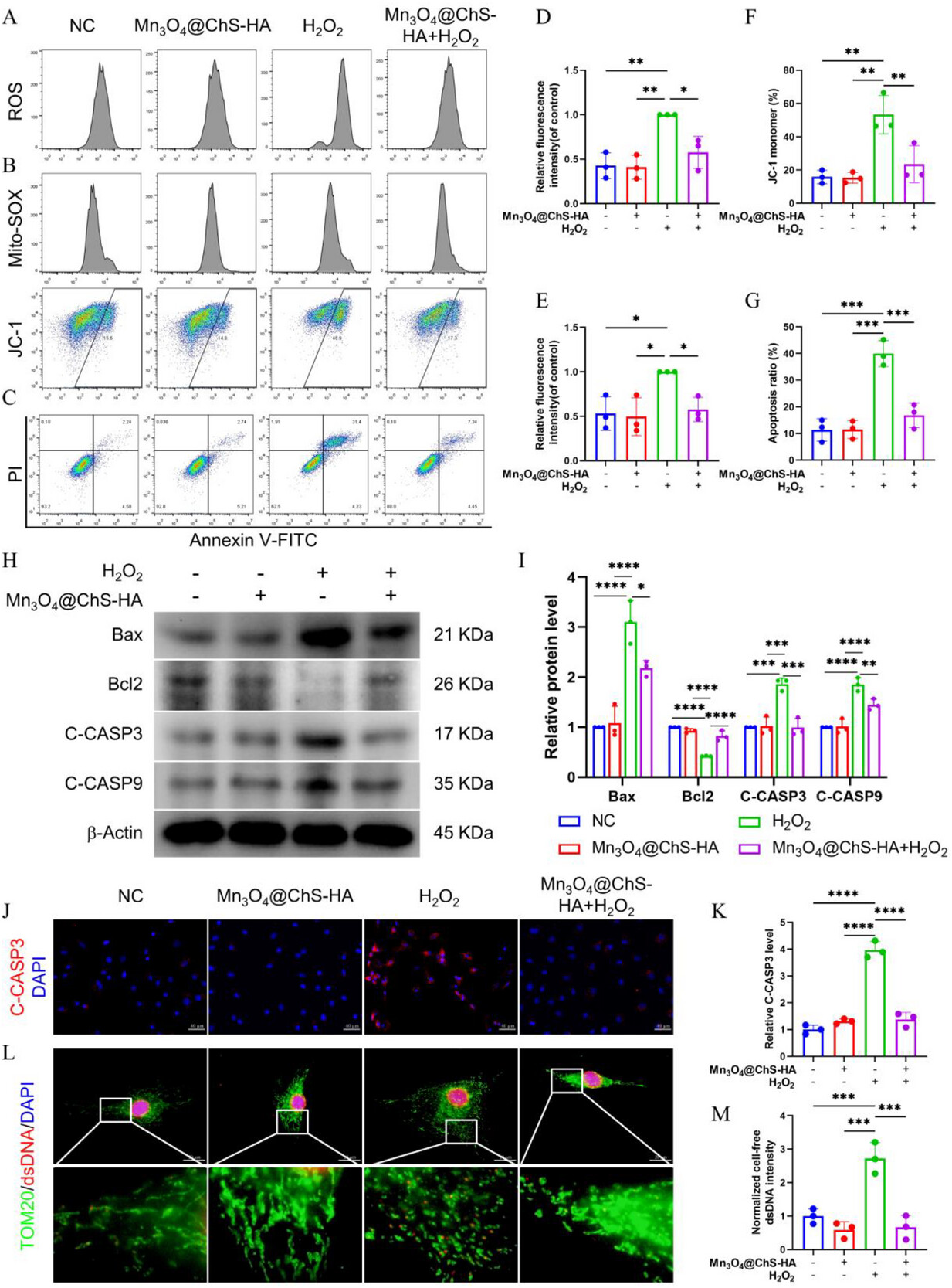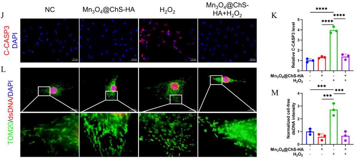Results demonstrated that H2O2 stimulation significantly increased cytosolic dsDNA levels (red fluorescence), indicating mtDNA leakage and mitochondrial fission. The Mn₃O₄@ChS-HA hydrogel treatment group exhibited markedly reduced cytosolic dsDNA, confirming its capacity to preserve mitochondrial integrity.