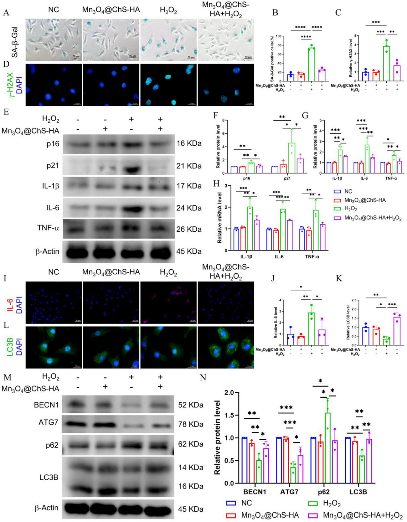 Following Mn3O4@ChS-HA treatment, SA-β-Gal⁺ senescent cells decreased by 70%, while autophagy marker LC3B fluorescence intensity increased 2.1-fold and autophagy initiator BECN1 expression was up-regulated. This indicates that ROS removal directly activates autophagic flux, which in turn clears damaged mitochondria, forming a positive feedback loop of “antioxidation → autophagy enhancement → anti-aging.” Moreover, autophagy activation simultaneously restrains inflammatory cytokine release, challenging the traditional view that senescence and inflammation are separately regulated.