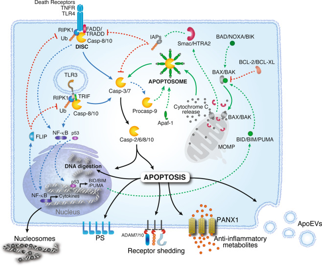 Once active, executioner caspases (i.e., caspase-2, -6, -8 and -10) bring about programmed apoptotic death. Apoptotic cells release messengers in the form of nucleosomal structures, shed receptors, anti-inflammatory metabolites or molecules packaged in apoptotic extracellular vesicles (ApoEVs). Phosphatidylserine (PS) molecules exposed on the outer surface of the plasma membrane function as “eat me” signals for phagocytes.