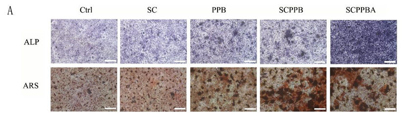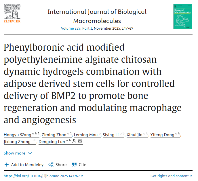 This study developed a new type of dynamic hydrogel SCPPBA, which is composed of sodium alginate-chitosan loaded with polyethyleneimine modified by phenylboronic acid, and is used to load BMP2 protein and adipose stem cells. This hydrogel can achieve long-term and controlled release of BMP2, effectively overcoming its shortcomings of short half-life and easy burst release. In vitro and mouse calvarial defect model experiments showed that this system can not only significantly promote osteogenic differentiation and bone regeneration, but also has good immunomodulatory functions, which can induce the polarization of macrophages to M2 type and promote angiogenesis, providing a synergistic treatment strategy for bone defect repair.