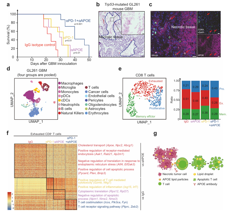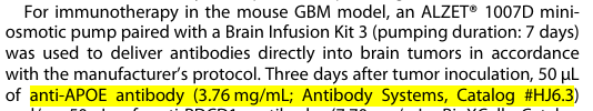 This study cited AntibodySystem's Anti-Mouse APOE Antibody (HJ6.3) (Product Code: RMB98601) and delivered the antibody into the mouse glioblastoma model through an intracranial micro-osmotic pump. The results showed that this antibody can effectively neutralize the APOE lipoprotein particles released from the tumor necrotic area, block the lipid accumulation and functional exhaustion of CD8+ T cells, and synergistically enhance anti-tumor immunity with anti-PD-1 antibody, significantly prolonging the survival of tumor-bearing mice.