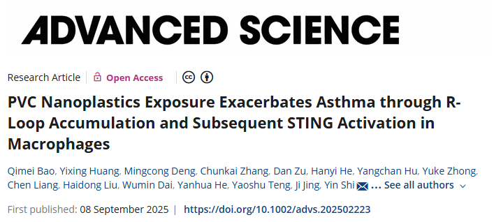 This study investigated the mechanism by which polyvinyl chloride nanoplastics (PVC NPs) exacerbate asthma by regulating R-loop accumulation and the STING signaling pathway in macrophages. It was found that inhaled PVC NPs accumulate in the lungs, inhibit the expression of RNASEH1, lead to abnormal accumulation of R-loops, and then activate the cGAS–STING pathway, promoting macrophages to release inflammatory factors such as IL-4, IL-5, and IL-13, and aggravating airway hyperresponsiveness, mucus secretion, and collagen deposition. In STING knockout mice, the inflammatory response induced by PVC NPs was significantly alleviated. This study reveals a new pathological mechanism by which environmental nanoparticles mediate immune responses through nucleic acid structures, and provides a new target for asthma prevention and treatment.