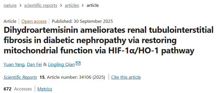 This study explored the therapeutic potential and mechanism of dihydroartemisinin (DHA) in diabetic nephropathy (DN). It was found that DHA can significantly improve renal function in DN rats, reduce pathological damage to renal tissue and renal tubulointerstitial fibrosis. Its mechanism is related to improving mitochondrial dysfunction, inhibiting oxidative stress, and downregulating the hypoxia-inducible factor HIF-1α. In-depth cell experiments showed that DHA does not inhibit the transcription of HIF-1α, but enhances its ubiquitination modification, thereby promoting the proteasomal degradation pathway of HIF-1α. This study reveals a new mechanism by which DHA, as a potential drug, improves diabetic nephropathy through the HIF-1α/HO-1 pathway.
