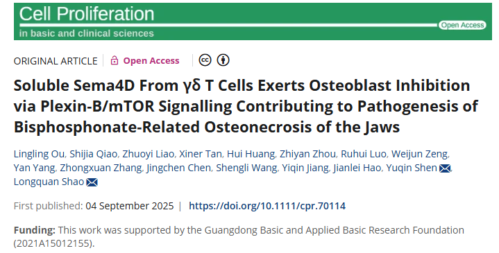 This study revealed a new mechanism of bisphosphonate-related osteonecrosis of the jaw (BRONJ): long-term use of zoledronic acid can activate and recruit γδ T cells to the jaw area, and the matrix metalloproteinase MMP3 secreted by them can cleave membrane-bound Sema4D to generate soluble Sema4D (sSema4D). sSema4D binds to Plexin-B1/2 receptors on osteoblasts and activates the mTOR signaling pathway, thereby inhibiting osteoblast differentiation and hindering bone regeneration. Based on this, the research constructed a composite hydrogel Gel-BG@ab that can continuously release anti-Sema4D antibody, which effectively neutralizes sSema4D, restores osteogenic function in animal models, and significantly reduces BRONJ lesions, providing a new strategy for immune-material combined therapy.