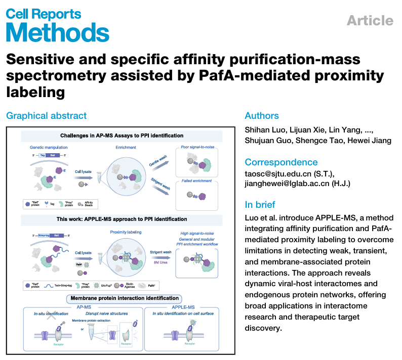 This study developed a new proteomics method called APPLE-MS, which combines Twin-Strep tag affinity purification with PafA-mediated proximity labeling technology. It effectively overcomes the limitations of traditional affinity purification-mass spectrometry in detecting weak interactions, transient interactions, and membrane protein interactions. The study confirmed that APPLE-MS has higher sensitivity and specificity, and has been successfully applied to the analysis of the dynamic interactome of SARS-CoV-2 viral protein ORF9B, the mapping of the endogenous PIN1 protein interaction network, and the in situ identification of membrane surface GLP-1 receptor complexes, providing a powerful universal tool for protein interaction research.