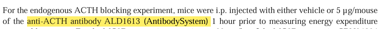 The article cited AntibodySystem's Research Grade Anti-Human ACTH (ALD1613) (Product Code: DHK28601) to neutralize the activity of endogenous ACTH in both in vitro cell respiration assays and in vivo mouse experiments. This experiment aimed to block the function of ACTH to explore its physiological regulatory role in brown adipose tissue thermogenesis and body energy consumption under cold exposure.