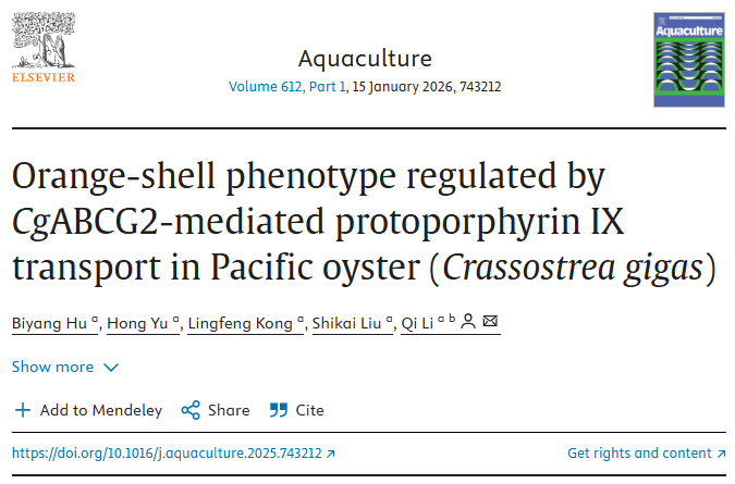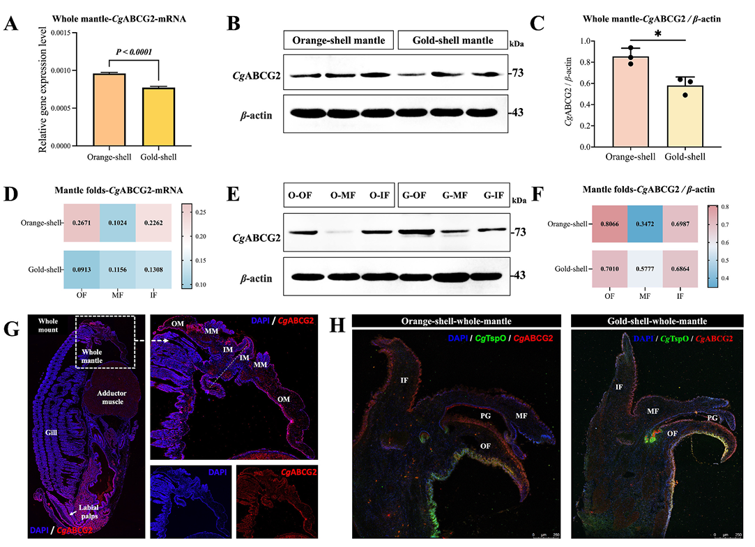 This study found that the ATP-binding cassette transporter G2 (CgABCG2) in the Pacific oyster is a key transporter regulating the formation of the orange shell phenotype, which is responsible for transporting protoporphyrin IX (PPIX) in the cytoplasm to the shell matrix. Through multi-omics analysis, molecular docking, in vitro inhibitor treatment, and in vivo RNA interference experiments, it was confirmed that the expression level of CgABCG2 is positively correlated with PPIX accumulation and shell color intensity, and its function has a differential regulatory effect in different shell color strains. This study is the first to verify the ABCG2-mediated PPIX transmembrane transport mechanism in mollusks, providing an important molecular basis for understanding shell pigment deposition and shell color breeding of aquatic animals.