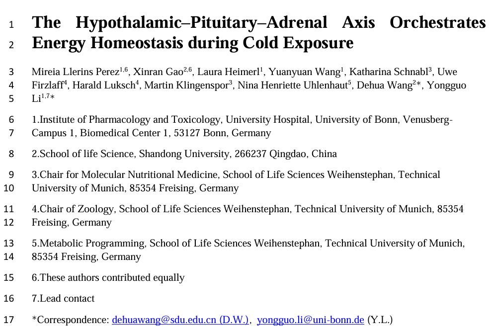 This study revealed the dual role of the hypothalamic-pituitary-adrenal (HPA) axis in coordinating energy homeostasis under cold exposure: Adrenocorticotropic hormone (ACTH) secreted by the pituitary directly stimulates heat production by activating the MC2R receptor on brown adipocytes, while glucocorticoids secreted by the adrenal glands drive cold-induced hyperphagia to compensate for energy consumption. The study verified the necessity of the ACTH-MC2R pathway in cold adaptation through neutralizing antibodies, receptor antagonists, and gene knockdown methods, and found that glucocorticoids have a "permissive" effect on ACTH function to prevent receptor desensitization. This finding deepens the understanding of the neuroendocrine system regulating energy balance and provides new ideas for obesity treatment.