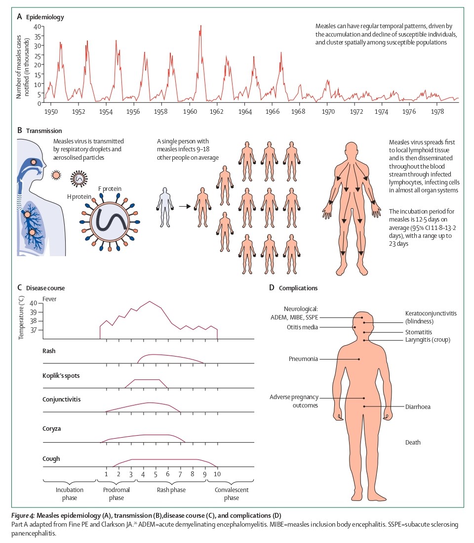 Figure 4. Measles epidemiology (A), transmission (B), disease course (C), and complications (D)(Nat Rev Dis Primers. 2016 Jul 14:2:16049.)