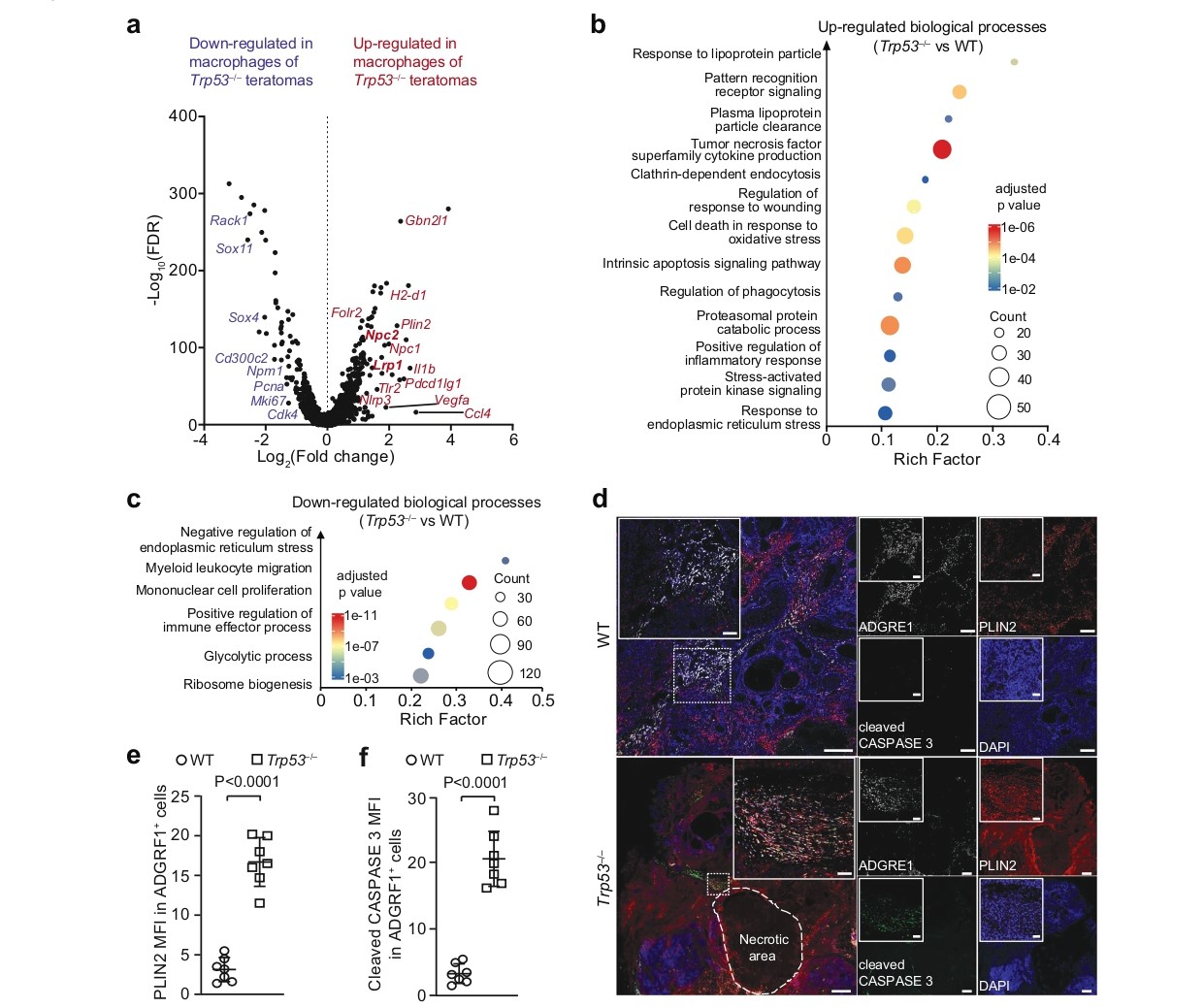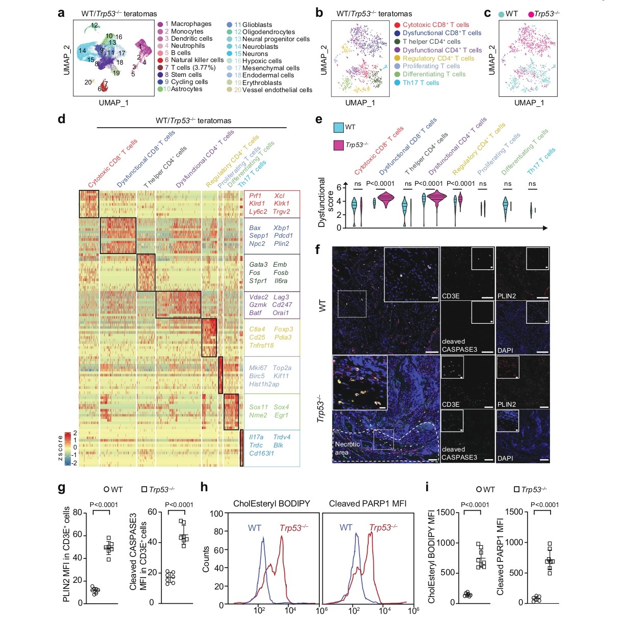 At the mechanistic level, the study found that Trp53-deficient teratomas exhibited significantly larger necrotic areas. Single-cell RNA sequencing analysis (Fig. 3a-e) revealed abnormal states of infiltrating T cells in Trp53⁻/⁻ teratomas: these T cells not only expressed exhaustion markers such as Pdcd1 and Lag3 but also upregulated genes related to endoplasmic reticulum stress and lipid metabolism. Immunohistochemistry and flow cytometry results (Fig. 3f-i) showed that T cells in Trp53⁻/⁻ teratomas had significantly increased levels of the lipid-droplet-associated protein PLIN2 and cholesteryl esters, along with elevated levels of the apoptosis markers cleaved Caspase-3 and cleaved PARP1, indicating that these cells were in a state of lipid accumulation and dysfunction.