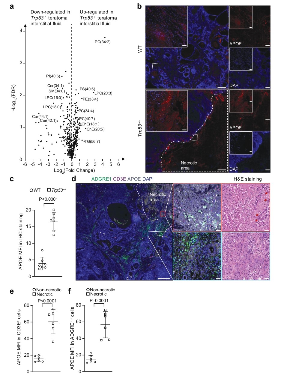 To investigate the mechanism by which loss of pro-apoptotic genes leads to immune evasion, researchers first observed large necrotic areas in Trp53–/– teratomas (Fig. 5a-b). Further lipidomics analysis showed that the interstitial fluid from these teratomas contained significantly higher levels of various lipids, particularly polyunsaturated phospholipids, cholesteryl esters, and triacylglycerols (Fig. 5a). Immunohistochemistry confirmed the presence of abundant extracellular APOE in necrotic areas, and both T cells and macrophages infiltrating these regions showed strong APOE uptake (Fig. 5b-f). These results directly link tumor necrosis, APOE-containing lipid particle release, and lipid uptake by immune cells. It is noteworthy that this phenomenon of lipid accumulation and dysfunction was observed not only in T cells but also in tumor-associated macrophages.