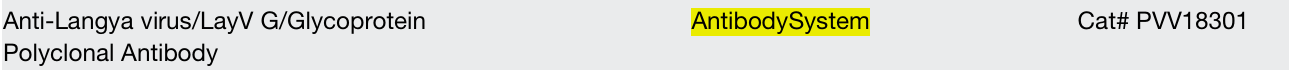 This study cited AntibodySystem's Anti-Langya virus/LayV G/Glycoprotein Polyclonal Antibody (Catalog #PVV18301), primarily used as a critical positive control reagent in WB and ELISA experiments to validate the experimental system's reliability and aid in characterizing the newly isolated monoclonal antibodies.