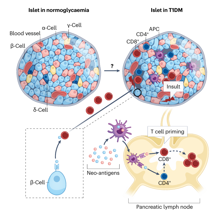 Fig 2. Major postulated mechanisms of pancreatic β-cell damage and destruction(Nat Rev Endocrinol. 2025 Oct;21(10):608-622.)