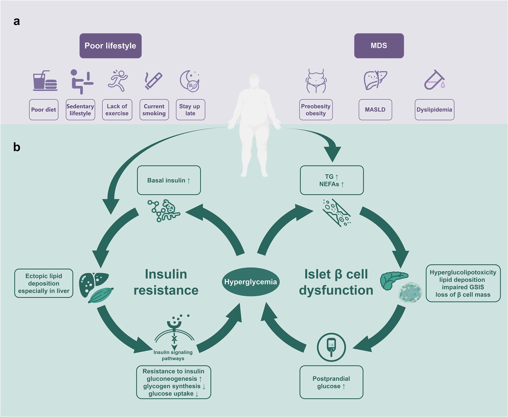 T2D is a heterogeneous disease characterized by progressive loss of pancreatic β-cell insulin secretion, typically developing after the onset of insulin resistance (IR). As an integral component of metabolic syndrome (MS), it has been termed Metabolic Dysfunction Syndrome (MDS). The pathogenesis of T2D remains incompletely understood, with both insulin resistance and β-cell dysfunction playing central roles in the pathophysiology.