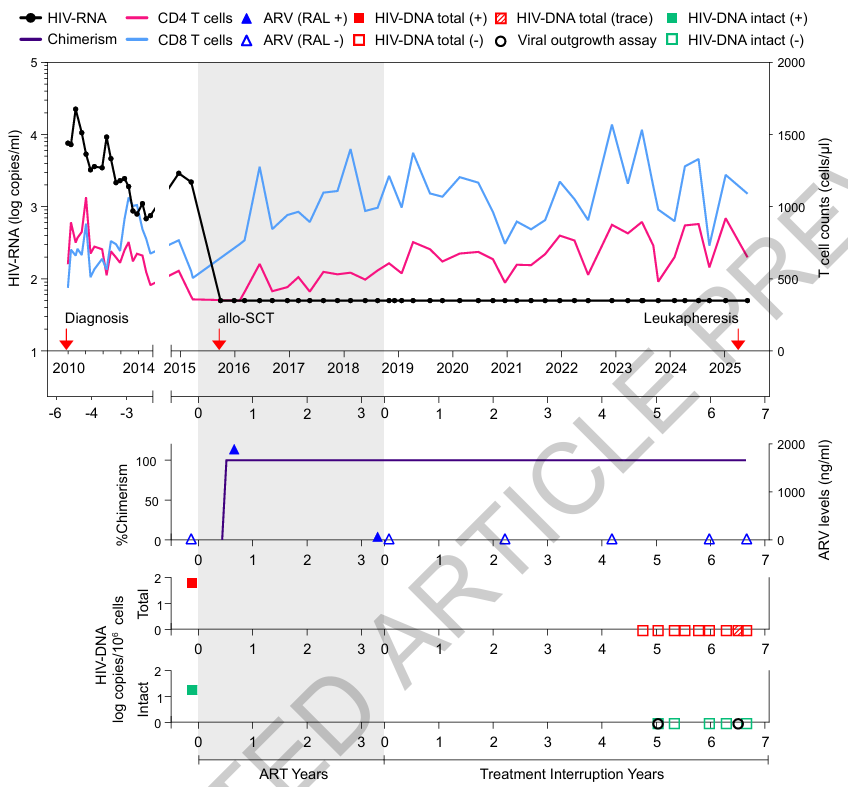 After discontinuation of antiretroviral therapy (ART) under strict clinical monitoring, the patient was subjected to comprehensive longitudinal virological assessments. These included measurements of plasma HIV-1 RNA, quantification of HIV DNA in peripheral CD4⁺ T cells, and assays for replication-competent virus. Throughout the follow-up period, no viral rebound was detected, and no replication-competent HIV was recovered.