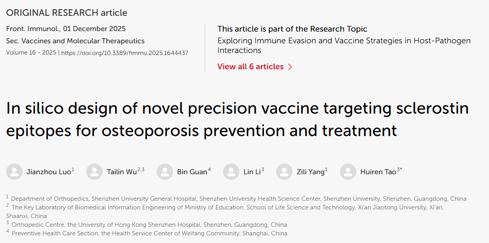 This study reports the development of a novel osteoporosis vaccine targeting sclerostin (SOST). Based on the high-affinity SOST131–163 epitope recognized by Romosozumab, the epitope was fused to a diphtheria toxin translocation domain to overcome immune tolerance and induce high-titer antibodies in mice. The elicited antibodies inhibited osteoclast differentiation and promoted osteoblast mineralization, offering a cost-effective strategy for early prevention and long-term treatment of osteoporosis.
