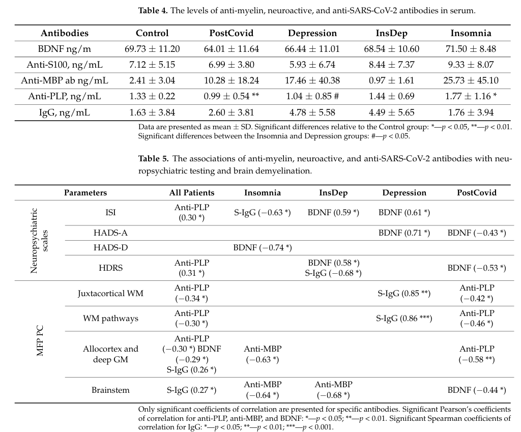 This study demonstrates that insomnia and depressive symptoms in long COVID patients are associated with distinct cognitive impairments and patterns of white matter demyelination. Patients with insomnia exhibited the most pronounced global cognitive and executive dysfunction, accompanied by widespread demyelination, while patients with depression showed deficits primarily in attention-related tasks. Serum anti-PLP antibody levels were highest in the insomnia group and correlated with symptom duration and demyelination severity.