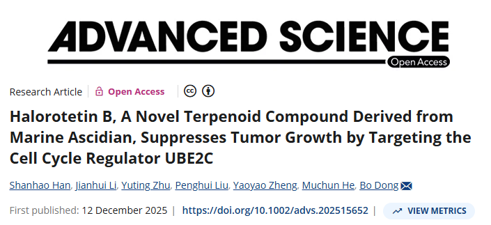 This study identifies Halorotetin B, a novel terpenoid isolated from edible ascidians, as a potent tumor growth inhibitor. Mechanistically, Halorotetin B directly targets the E2 ubiquitin-conjugating enzyme UBE2C, inhibiting the ubiquitin-mediated degradation of cyclin B1 and securin. This leads to M-phase arrest and cellular senescence in tumor cells, offering a promising strategy for developing ascidian-derived anticancer agents targeting UBE2C.