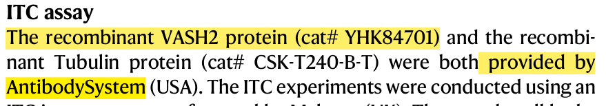 AntibodySystem’s Recombinant Human VASH2/Vasohibin-2 Protein, N-His-SUMO (Cat. No. YHK84701) was used in isothermal titration calorimetry (ITC) assays to demonstrate that the microtubule inhibitor KY216 markedly enhances the interaction between VASH2 and tubulin. The presence of KY216 increased the binding affinity by approximately 2.9-fold and reduced the Gibbs free energy of the interaction. These results provide critical molecular interaction evidence that KY216 suppresses metastasis by stabilizing the VASH2–tubulin complex, promoting α-tubulin detyrosination, and inhibiting ZEB1 activity.