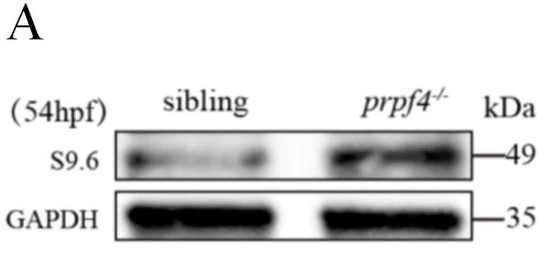 AntibodySystem’s Anti-DNA–RNA Hybrid Antibody (S9.6) (Cat. No. RGK60001) was used in Western blot analyses to demonstrate R-loop accumulation in erythroid progenitors following Prpf4 loss of function, providing critical molecular evidence for activation of the DNA damage response pathway.